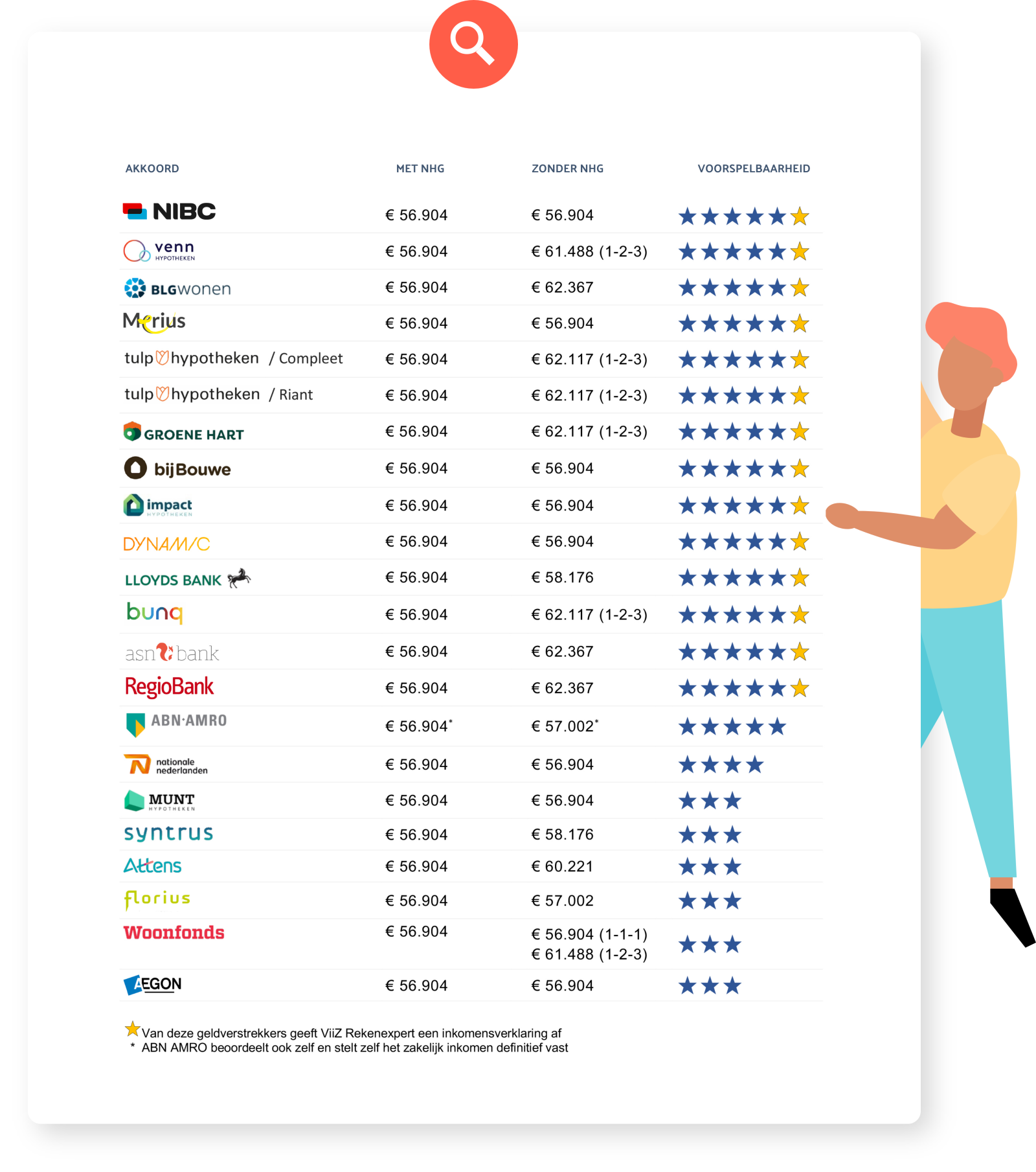 Voor de geldverstrekkers met 5 sterren én een gouden ster ★★★★★★ is de voorspelbaarheid het grootste en voor deze aanbieders kunnen wij als rekenexpert aanvullend een inkomensverklaring zonder NHG afgeven.